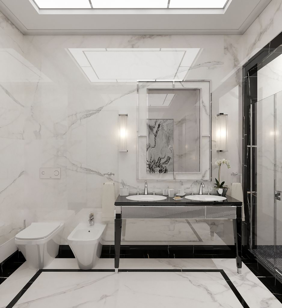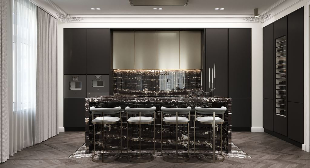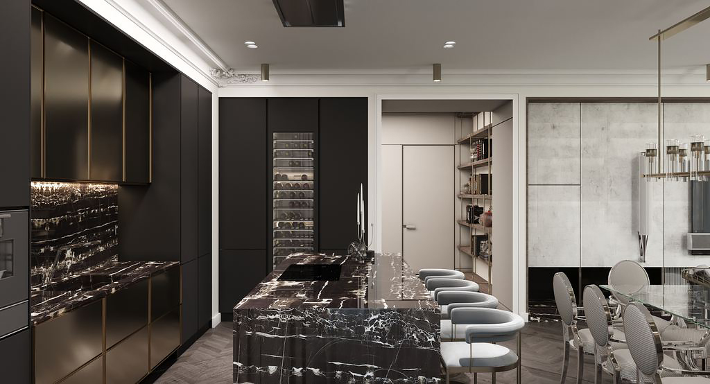 Интерьер квартиры в ЖК "Смольный парк" выполнен в современном стиле с элементами эклектики. Отличительной особенностью интерьера является активное использование различных материалов и стилей — это редкий и очень сложный дизайнерский прием, но мы смогли подружить разные фактуры и текстуры и сбалансировать весь интерьер. Например, в гостиной задействованы два разных металла — в основе дивана лежат хромированное основание, а в креслах используется латунь. Отметим, что светло-серые шторы и практически белый ковер делают комнату более светлой и уютной.