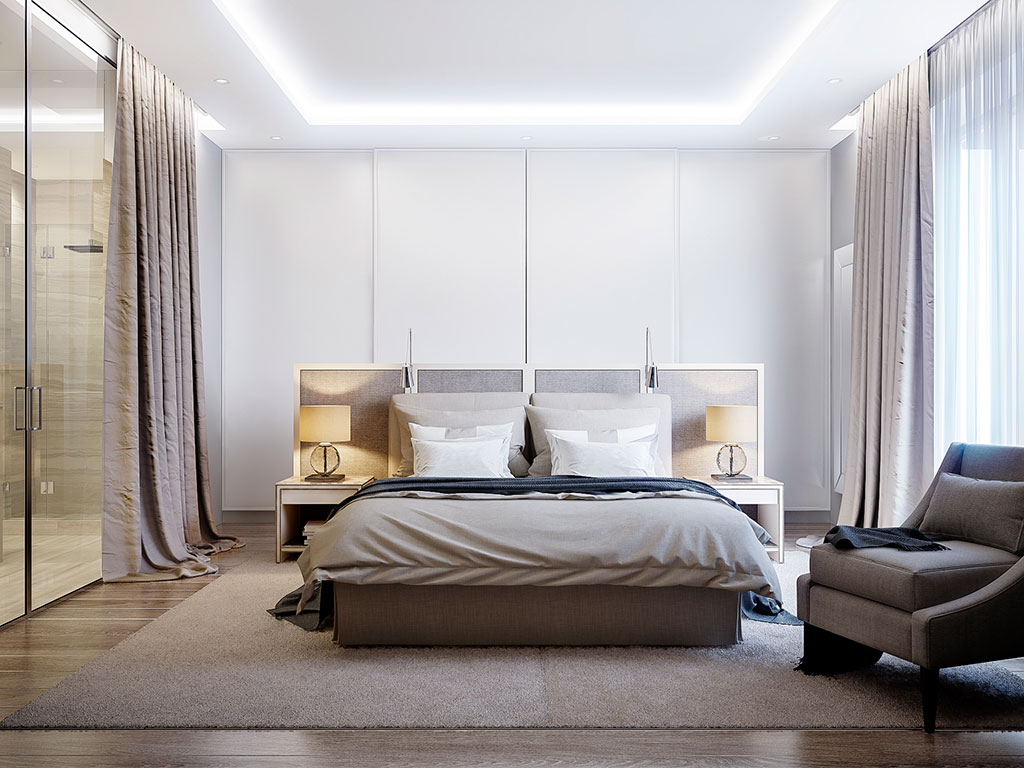Лаконичная простота отличает дизайн спальни в квартире. К двум основным оттенкам палитры интерьера — белому и бежево-коричневому — добавляется серый, и все вместе они создают уникальную успокаивающую атмосферу.