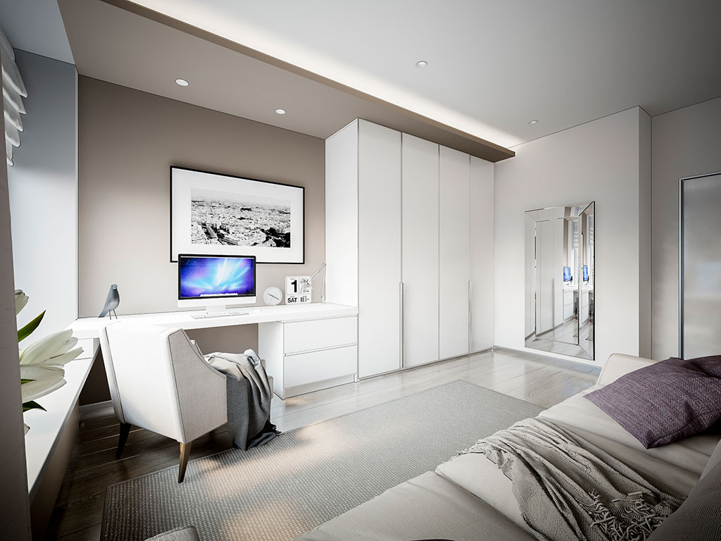Преобладание белого цвета характерно для кабинета и гостевой комнаты. Здесь господствуют простые формы удобной мебели и нет лишних предметов, только «я и мои светлые мысли» - идеальная обстановка для умственного труда.