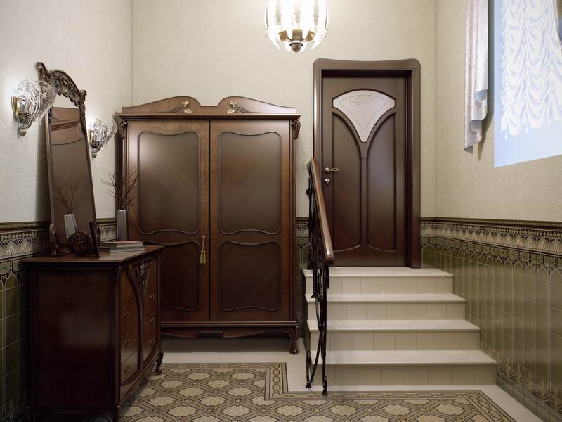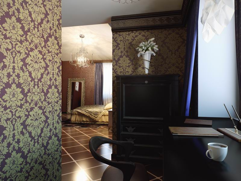 Основные цвета, использованные в оформлении кухни-столовой – зеленый и бледно-оливковый. Нижняя часть стен отделана обтянутыми тканью панелями, верхняя украшена узорами, которым вторят плавные линии наборного паркета. Блок кухонной мебели выполнен в виде массивного деревянного буфета с резьбой и медными накладками. В том же стиле подобрана и другая мебель, кресла, обитые зеленым бархатом, удобные стулья с гнутыми спинками, шкафы для посуды. Изящные светильники озаряют комнату мерцающим светом, создавая атмосферу загадочности, столь свойственную модерну. Такой же эффект производит и неправильная планировка столовой, где за каждым изгибом стены вас может ждать, и действительно ждет неожиданность