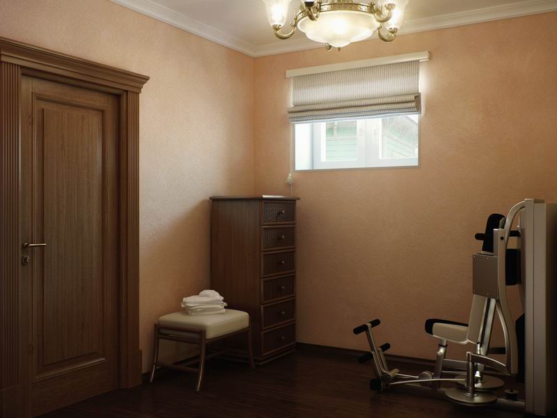 Спортивные тренажеры, непременный атрибут процедуры физического восстановления и отдыха, вряд ли органично вписались бы в это помещение. Поэтому их расположили в «предбаннике», небольшом холле перед комнатой отдыха. Отсюда же берет начало и лестница, соединяющая все уровни дома.